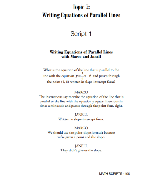 MathScripts: Algebra 1 transforms everyday algebra practice into short, meaningful conversations. Students pair up and read through structured script dialogues that model how to reason, explain, and make sense of algebraic steps — instead of silently guessing or memorizing procedures.
